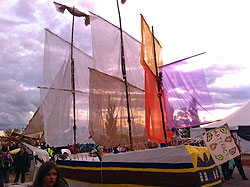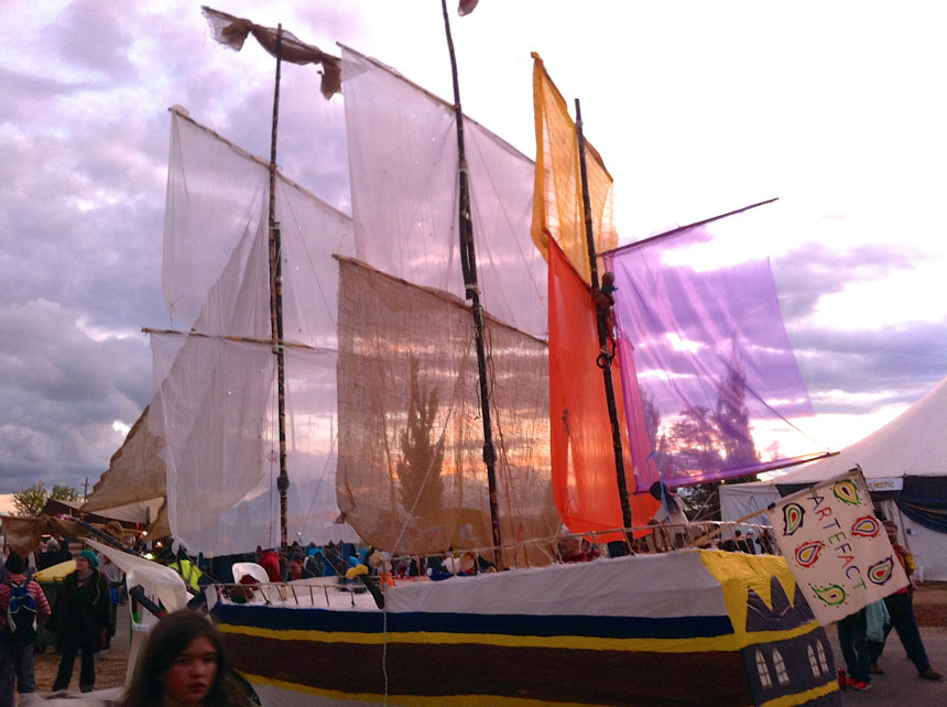 75.April 2015 Set Construction A 1/10 scale model of the 'Endeavour' was made from cane, paper and other material as an excercise in movie set construction. Andrew Vial was one of the four creators and builders.