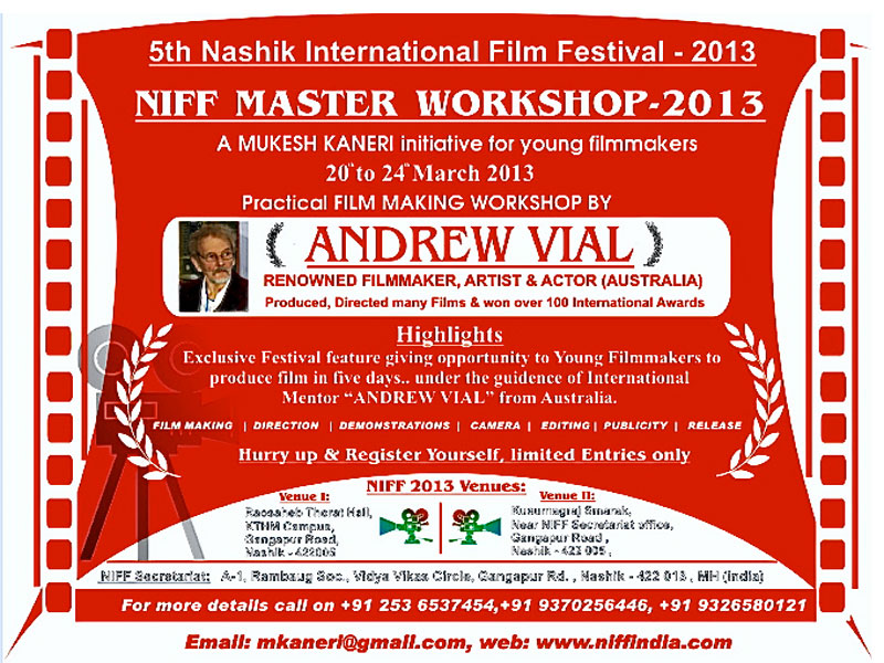 51.March 2013 Invited by Indian city of Nashik Andrew vial was requested to give a Directing masterclass at KTM University, Nashik and make a film to celebrate the 'One Hundred Years of Indian Cinema'.